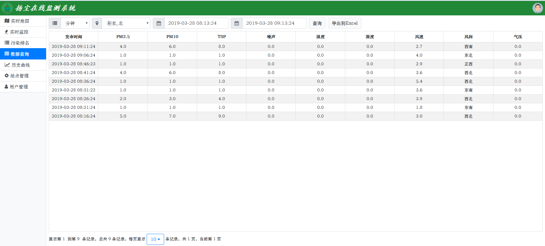 歷史數(shù)據(jù)查詢:系統(tǒng)提供歷史數(shù)據(jù)查詢功能,用戶通過設(shè)置時(shí)間類型、站點(diǎn)、查詢時(shí)間選項(xiàng)后,即可查看到所選擇站點(diǎn)的歷史數(shù)據(jù)信息,包括各項(xiàng)監(jiān)測因子、數(shù)據(jù)更新時(shí)間等,查詢結(jié)果支持選用EXCEL文檔形式導(dǎo)出。