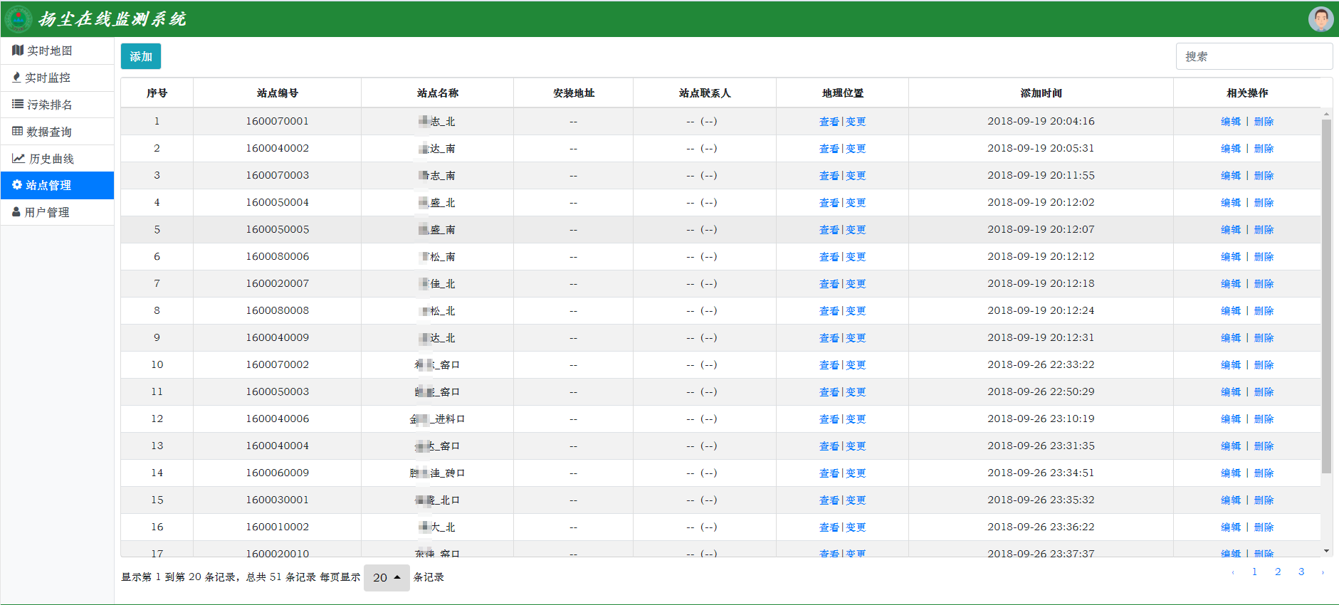 站點(diǎn)管理:用戶在此模塊可以實(shí)現(xiàn)監(jiān)測點(diǎn)位信息的增、改、查、刪等基本操作,點(diǎn)位信息包括監(jiān)測點(diǎn)位名稱、地址、經(jīng)緯度、站點(diǎn)ID、所在區(qū)域名稱等內(nèi)容,實(shí)現(xiàn)點(diǎn)位信息的動(dòng)態(tài)管理,區(qū)域與編號(hào)為鎖定狀態(tài),可自行配置名稱、經(jīng)緯度、排名、公開、掉線預(yù)警等選項(xiàng)。