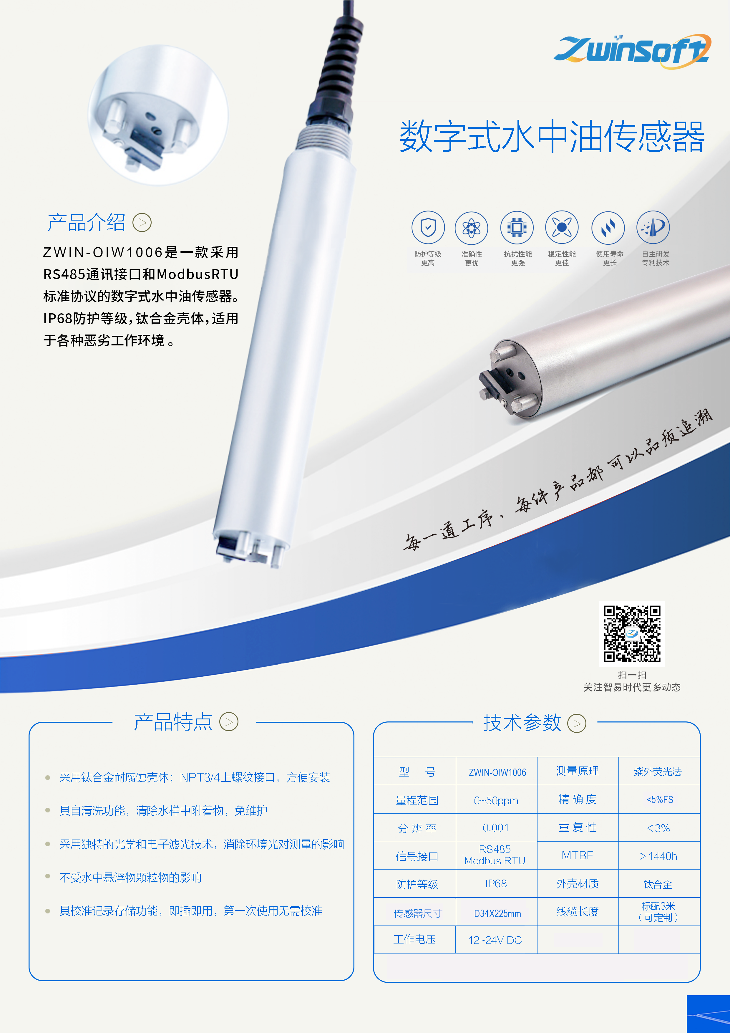 ZWIN-OIW1006是一款采用RS485通訊接口和ModbusRTU標準協(xié)議的數字式水中油傳感器。IP68防護等級,鈦合金殼體,適用于各種惡劣工作環(huán)境。