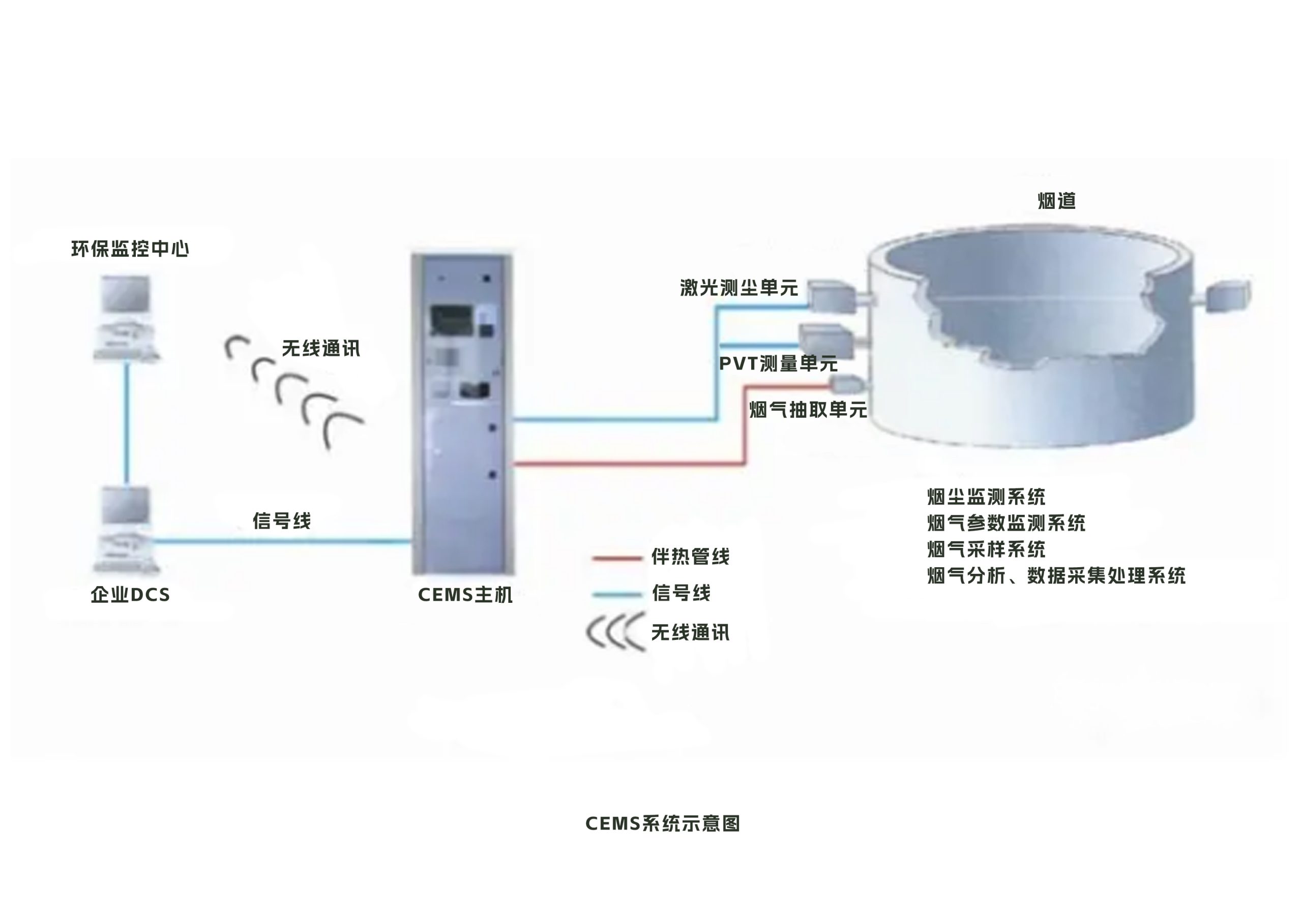 CEMS主要由煙氣參數(shù)測量子系統(tǒng)、顆粒物CEMS、氣態(tài)污染物CEMS、數(shù)據(jù)采集與傳輸?shù)葐卧啥?,形成一個集數(shù)據(jù)采集、處理、顯示、通訊、遠程監(jiān)控的一體化系統(tǒng)。