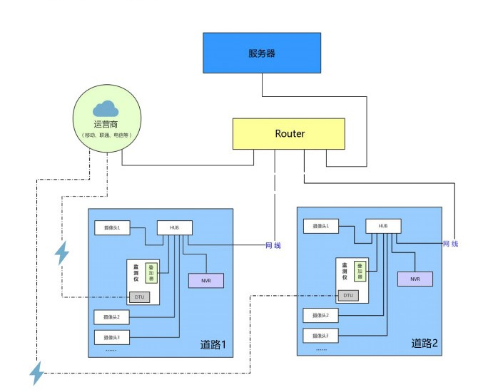 道路交通空氣質(zhì)量監(jiān)測系統(tǒng)可以將兩個及以上的道路段區(qū)域進(jìn)行連接,多方位監(jiān)控,并通過無線路由器將數(shù)據(jù)上傳到一個服務(wù)器,方便運(yùn)營商的操作與管理。下圖為系統(tǒng)的網(wǎng)絡(luò)拓?fù)浼軜?gòu)圖。